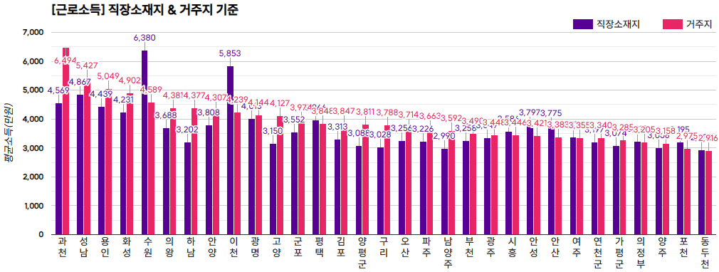 수원시의 경우는 광교와 같은 좋은입지를 갖춘 지역이 있어 주거환경도 좋지만, 소득이 굉장히 높은 삼성전자가 위치하고 있어 직장소재지 기준 근로소득이 높게 나타났구요.