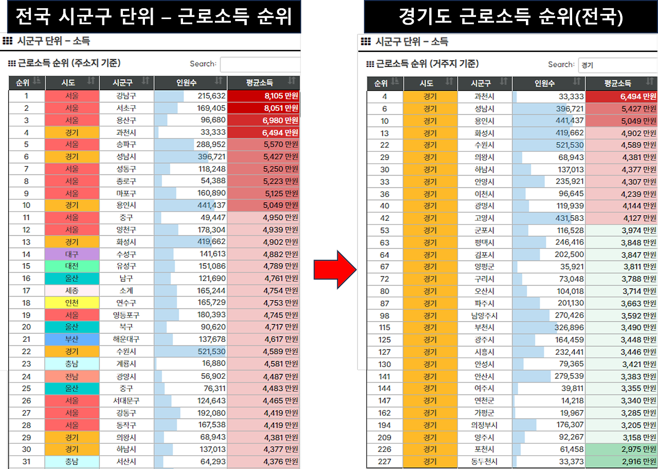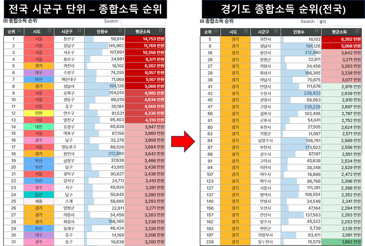 앞서 살펴본 경기도의 소득 순위가 전국 시군구 차원에서 어떤 위치에 있는지 자세히 알아보겠습니다.
