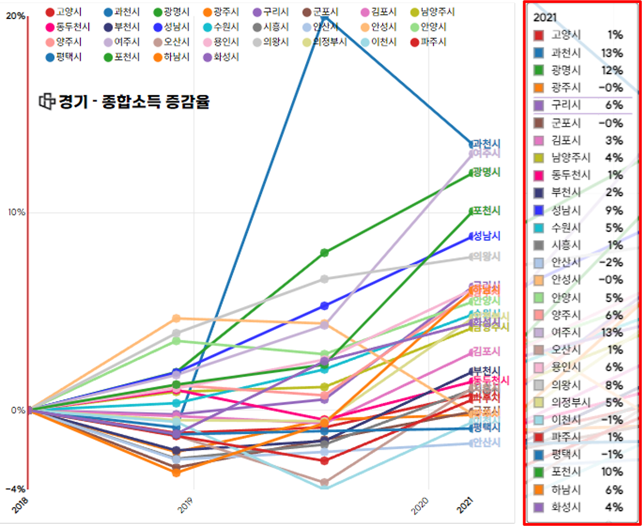 과천, 성남, 용인, 하남 등과 같이 입지가 좋은 지역들이 근로소득 및 종합소득에서 높은 순위를 나타내고 또, 증감율을 보이고 있습니다.