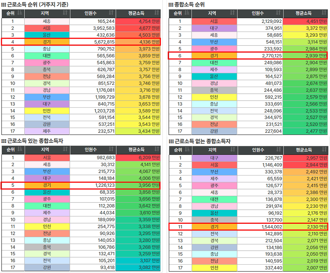 2021년 경기도의 평균 근로소득(거주지 기준)은 4,136만원으로 전국 4위입니다.