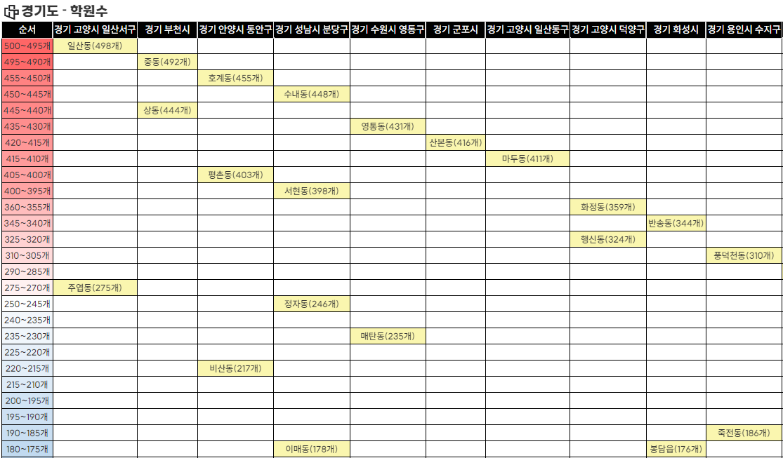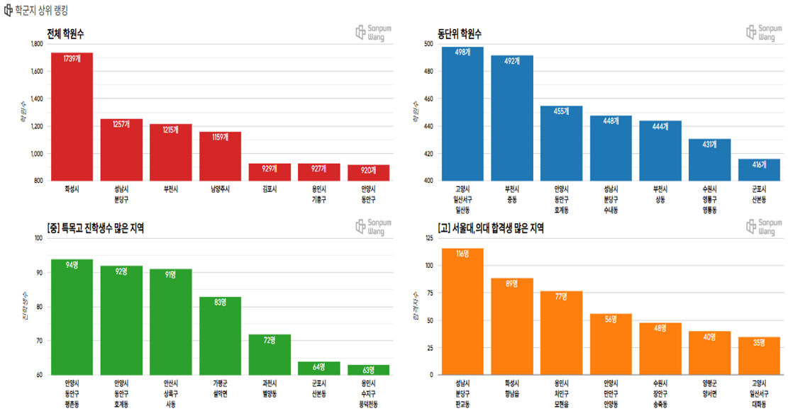 - 시/구단위 학원수 랭킹은 화성시(1739개) > 성남 분당구(1257개) > 부천시(1215개)... 순이고