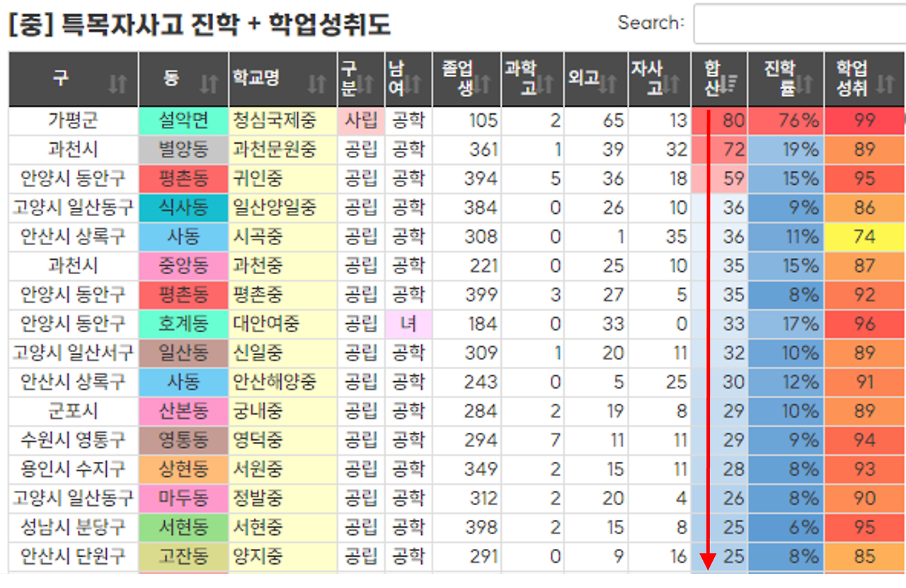 위에 표는 특목자사고 진학생 수가 높은 학교를 기준으로 나열한 것입니다.