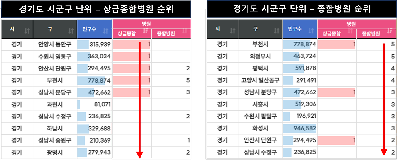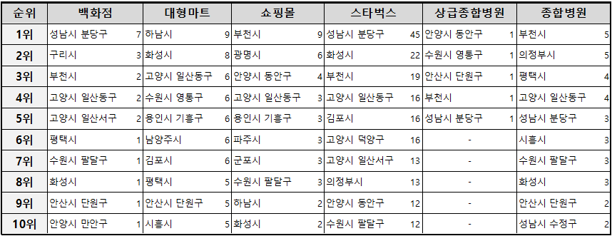 - 성남시 분당구는 백화점과 스타벅스에서 각각 1위를 차지하며, 종합병원도 3개를 보유하고 있어 상업적 인프라와 의료 서비스 모두에서 경기도 내 최고 수준임을 확인할 수 있습니다. 이는 분당구가 상업적으로도 번성하고, 의료 서비스 측면에서도 우수한 지역임을 나타냅니다.