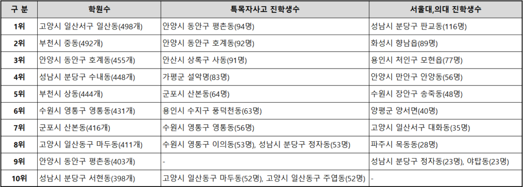경기도 내 특목고 진학생수 상위 10위 동별 순위는