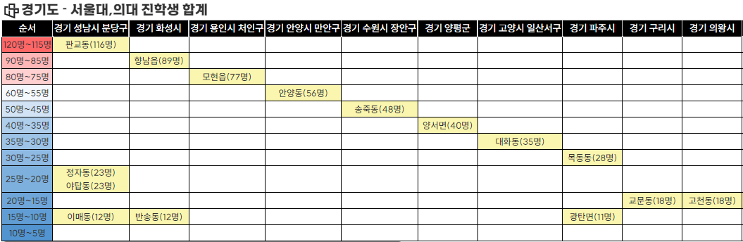 - 서울대,의대 합격생수 랭킹는 성남 판교동(116명) > 화성 향남읍(89명) > 용인 모현읍(77명).. 순입니다.