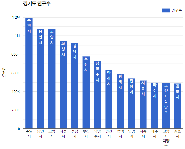 수원시(120만명) > 용인시(108만명) > 고양시(107만명) > 화성시(95만명) > 성남시(92만명)... 순입니다.