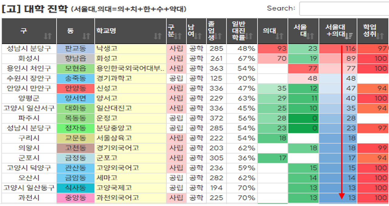 - 서울대,의대 진학생 수 : 서울대학교와 의과대학은 우리나라에서 가장 선호하는 교육 기관 중 하나입니다. 이러한 대학에 진학하는 학생 수는 지역 학생들의 학업 성취도가 매우 높음을 나타내는 중요한 지표입니다.