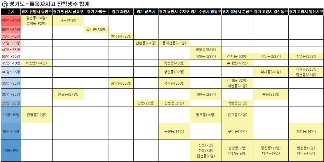 반면, 안양시 동안구, 일산동구, 상록구, 일산서구, 영통구, 수지구, 분당구 같은 지역은 특목자사고에 진학하는 학생 수가 최상위에 속하는 학교는 별로 없지만 5명~30명으로 중상위권에 속하는 학교가 많이 밀집해있어, 상대적으로 더 좋은 학군지로 볼 수 있겠습니다.